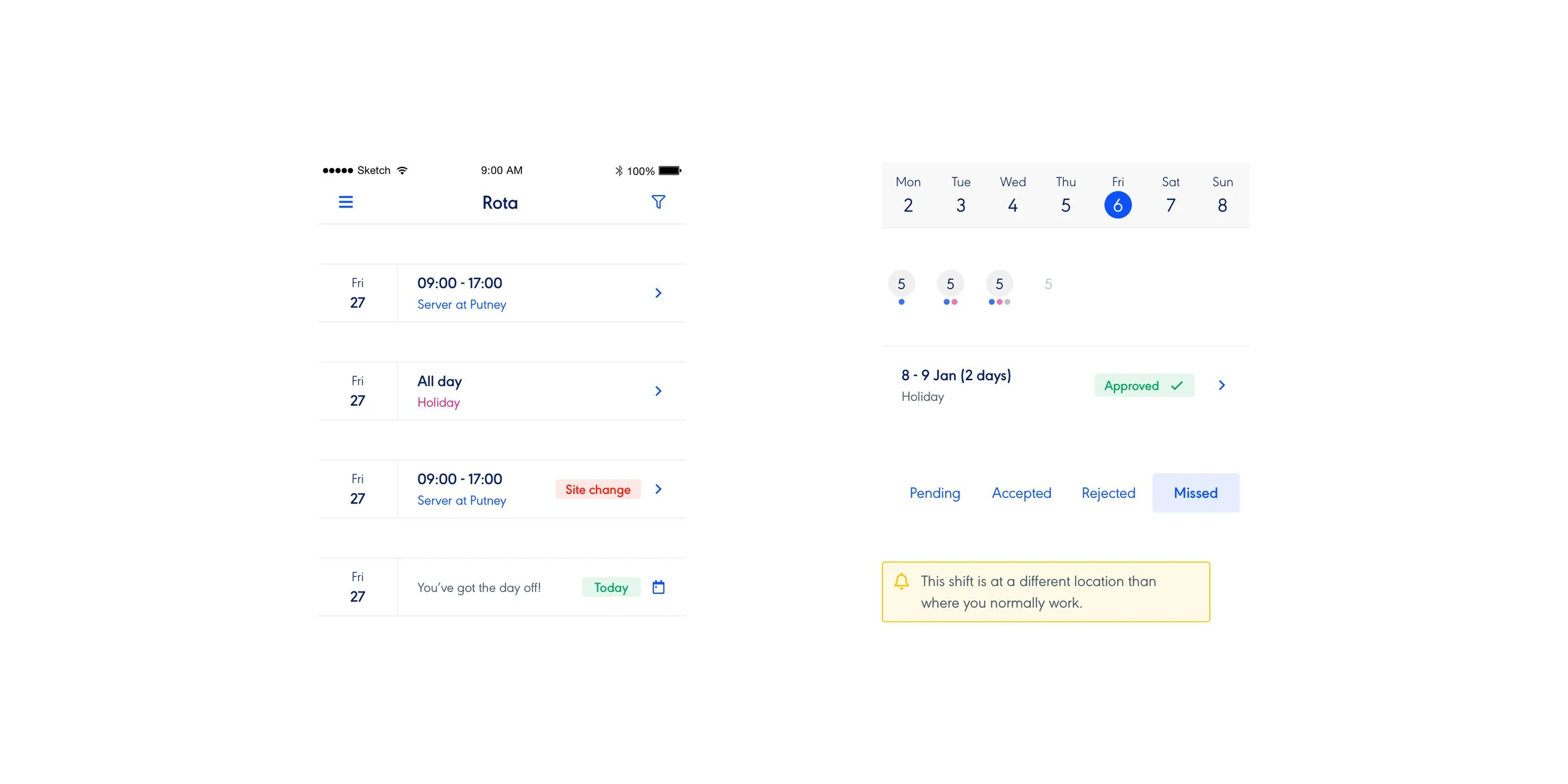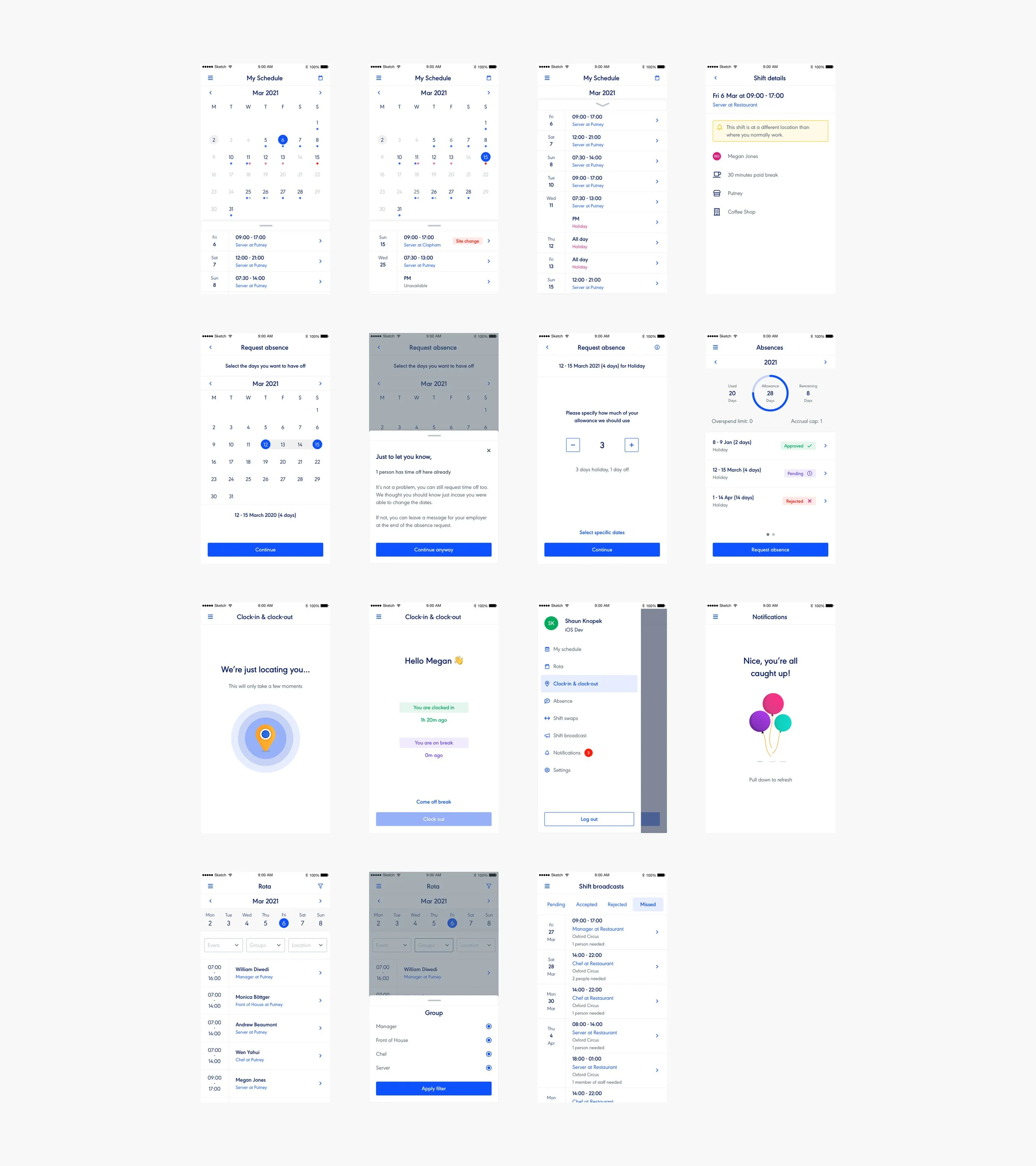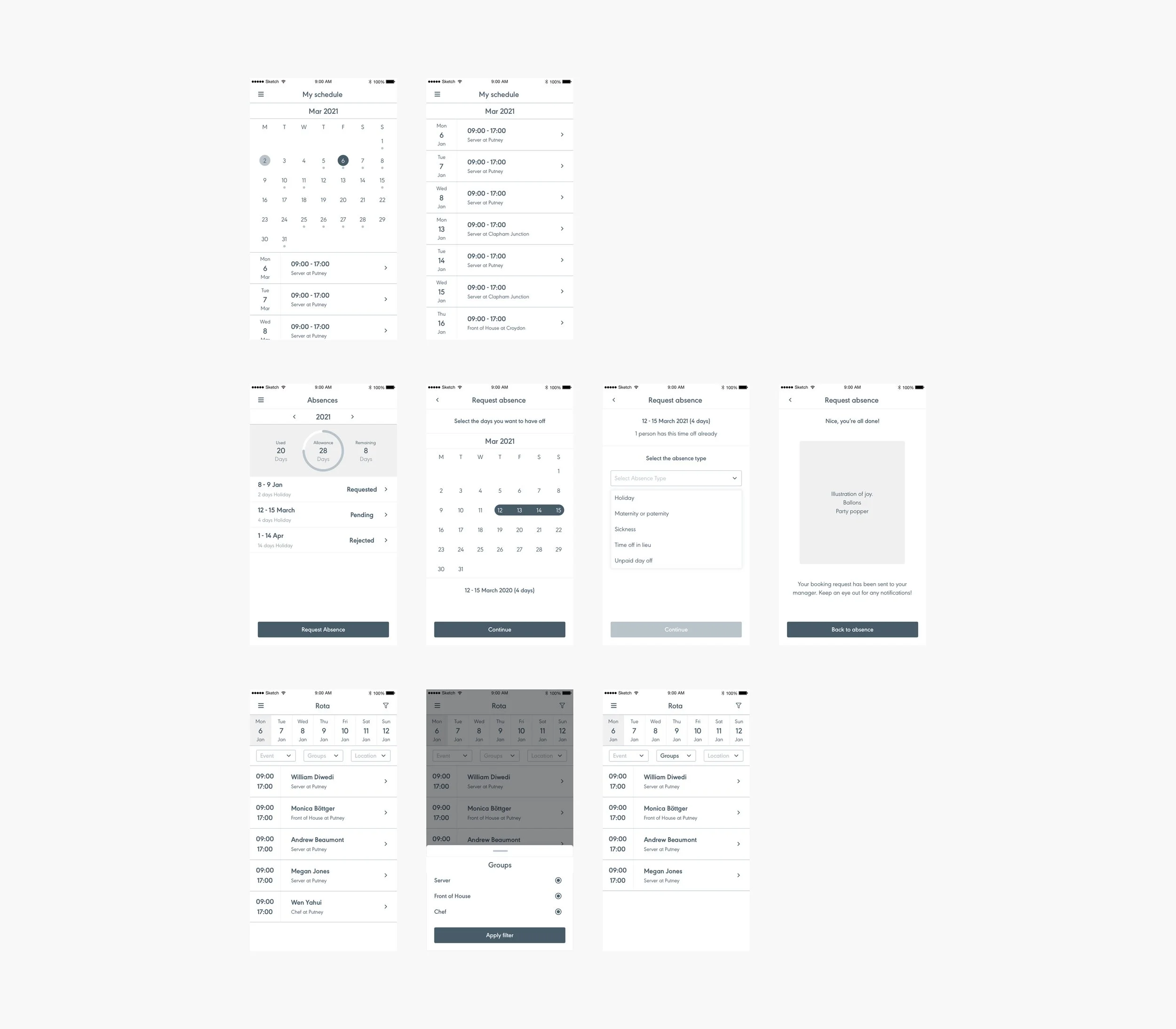 The wireframes started to take shape, using the Rotaready’s component library, we started to put together full pages. There were also bespoke components to the project. Things that weren’t going to be used across the wider product. These were purpose built for the mobile app. This was an iterative stage, constantly showing and reevaluating with the stakeholders.
