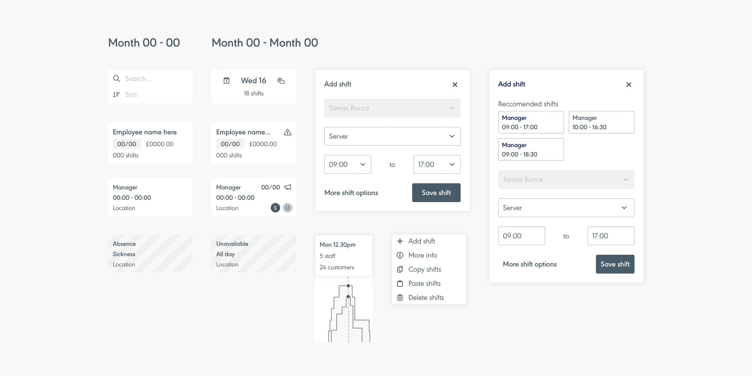 Throughout our research and workshops, the most intuitive design seemed to use an axis, one side having staff and the other having time. Using this as a starting point, I began to lay the pieces out from the architecture, forming a rough structure for the page. We worked atomically allowing me to focus on specific components and their function, bit by bit, building up to whole pages.